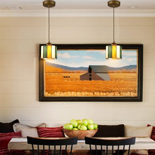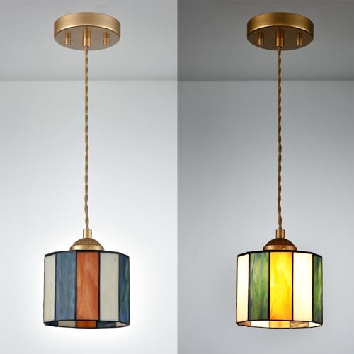 Tiffany Style Pendant Light Fixture: With multiple color splicing, this tiffany hanging light features a handmade cylinder-shaped stained glass lampshade, showing a vintage and elegant scene in your living spaces.