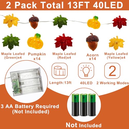 2 Pack 13 Ft 3D Pumpkin Lights 3 in 1 Fall Strings Lights: Package includes 2 pack 13 Feet 40 warm orange Led Lights, featuring 14 pumpkins, 14 acorns, and 3 colored maples leafed(4x red, 4x green, 4x yellow)