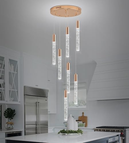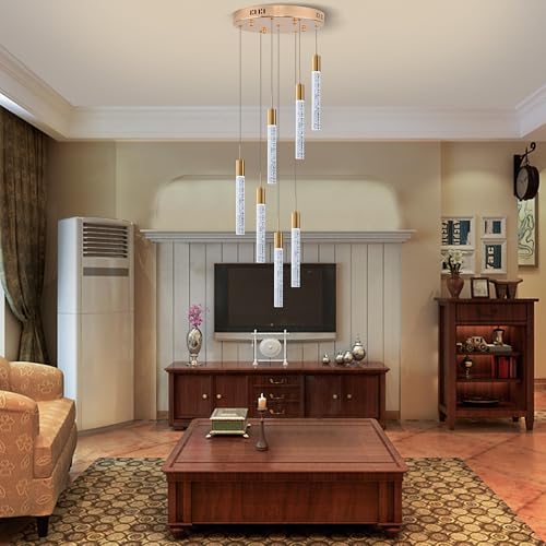 Modern Crystal Chandelier: Polished Gold finished metal ceiling canopy, 7x elegant bubble crystal column spiraling downward, the beautiful reflection of light through the bubbles in the clear crystal, creates a cozy and comfortable home atmosphere