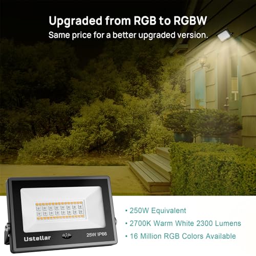 ?Upgraded 25W RGBW Flood Light?Ustellar 25W LED floodlight (250W Equivalent) has been upgraded from RGB to RGBW, 16 Million Colors plus 2300LM 2700K Warm White, to meet your lighting needs for both daily and festivals with just one light all the year around.