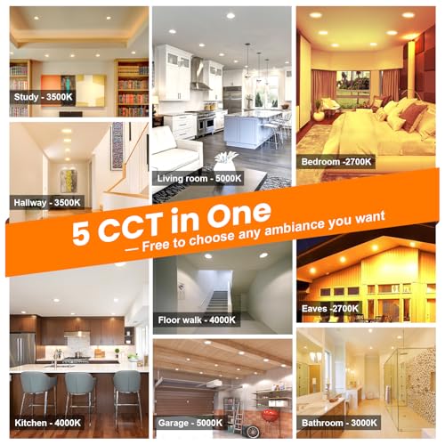 5 CCT-in-1: 5 color temperature(2700K, 3000K, 3500K, 4000K, 5000K) is selectable to you, which successfully eliminates the hassle of returning or exchange products due to inappropriate color temperature. Just slide the switch on the side of the J-box and you will get the most-desired color that best fit in your room type.