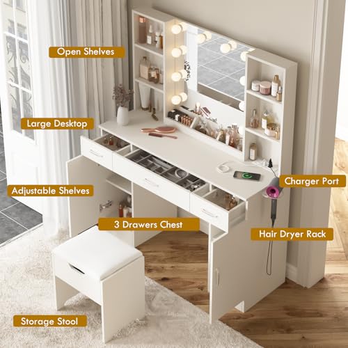?2-in-1 Functional Design with Charging Station?Open storage rack for easy access, large capacity drawer cabinet, with adjustable height laminates, perfect combination of vanity & cabinet. This makeup desk is also equipped with power outlets and USB ports to let you charge your phone, computer and other electronic devices at the same time.