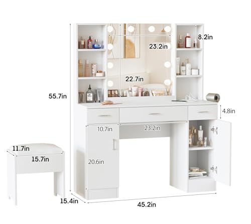 [Perfect size & Happy Experience]45.2”(L)*15.4”(W)*55.7”(H) Big vanity, and 15.8*11.7*15.74inch comfortable stool with PU cushion. High quality and unique frame design gives this girls vanity good stability and durability.