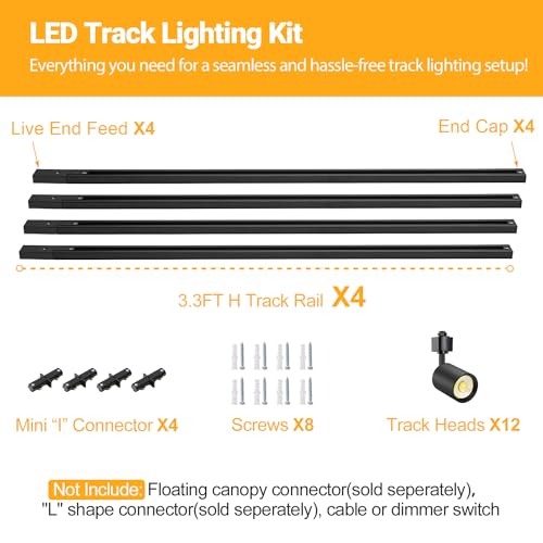 LED Track Lighting Kits: This set of LED track lighting include 12 track heads, 4X3.3FT h track lighting rails (totaling 13.2FT), 4 mini "I" connectors for connecting within h track rails, live end feeds, end caps, and screws. Please note that the "L" shape connector, floating canopy connector, dimmer, cord, and plug are not included
