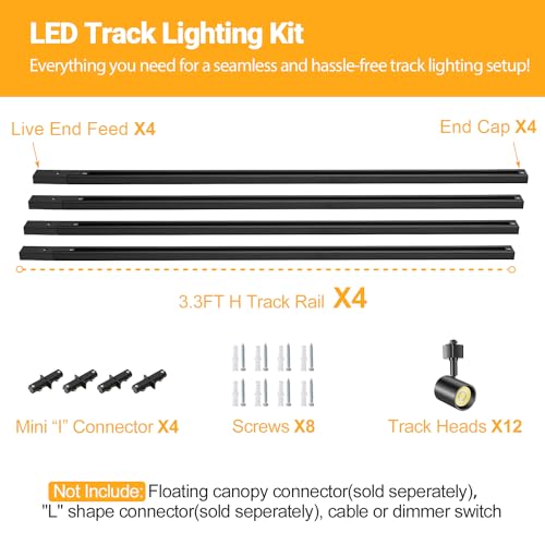 LED Track Lighting Kits: This set of black LED track lighting include 12 track heads, 4X3.3FT h track lighting rails (totaling 13.2FT), 4 mini "I" connectors for connecting within h track rails, live end feeds, end caps, and screws. Please note that the "L" shape connector, floating canopy connector, dimmer, cord, and plug are not included