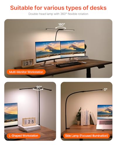 Dual-Head Desk Lamp: Featuring a double-head design, this LED desk lamp with clamp offers broader, more even illumination, ideal for L-shaped desks or multi-monitor workstations. The lamp head is rotatable, and whether used as a main light or a side lamp, it emits a soft, flicker-free glow that reduces eye strain and enhances work efficiency.