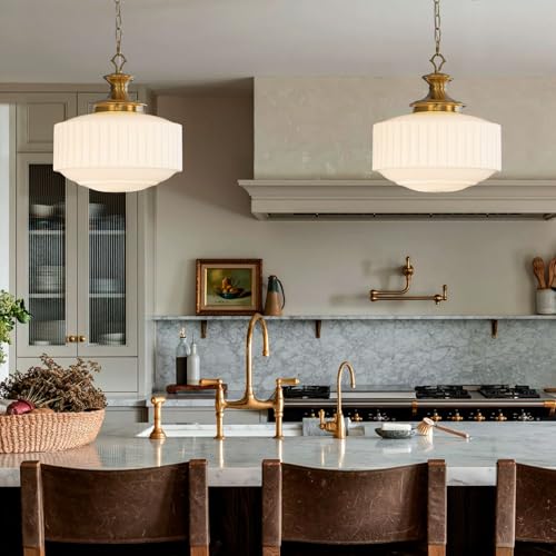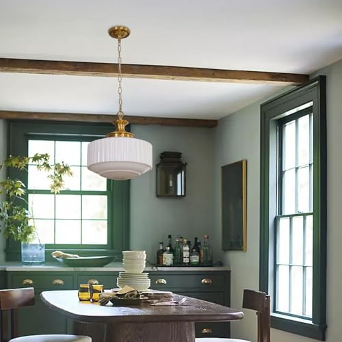 Design: Vintage-inspired pendant light featuring an antique brass finish and elegant pleated white glass drum shade for timeless sophistication, and it illuminates the restaurant in all directions from 360 degrees, the warm light from the milk glass pendant light creates a warm dining atmosphere, the light is soft and not dazzling