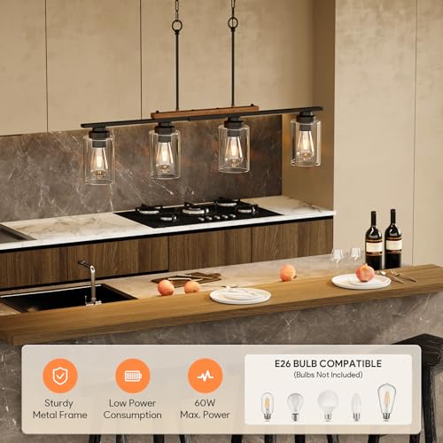 Inviting Ambiance: This 4-light farmhouse linear chandelier welcomes E26 bulbs up to 60W, providing bright, soft, and comfortable lighting to create a warm and inviting dining atmosphere