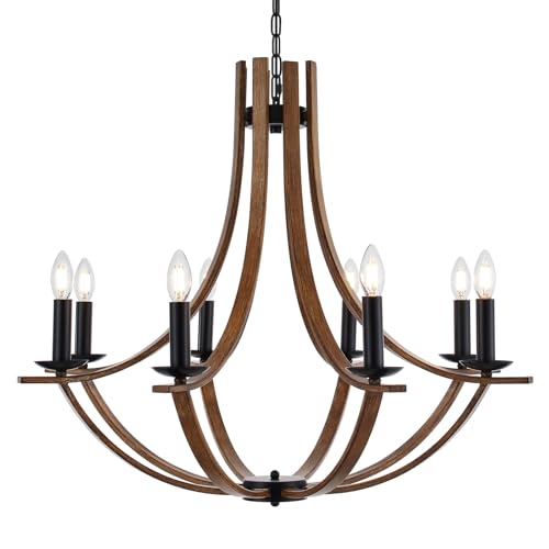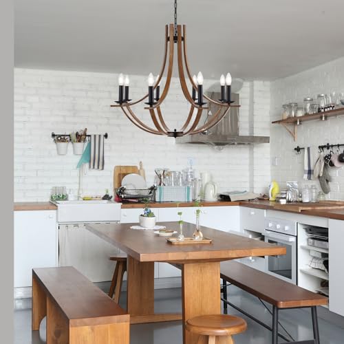 ?Vintage Farmhouse Design?The 8-lights chandelier features a hand-brushed wood grain color metal, adding a charming farmhouse vintage touch to any space. The candle style design with 8 lights creates a warm and inviting ambiance, perfect for dining rooms, living rooms, or bedrooms.