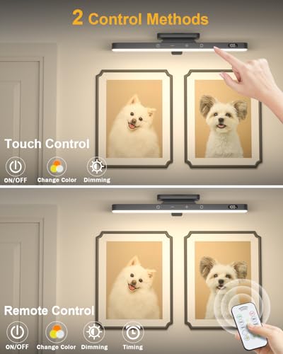 ????[3 Color Temperatures and Dimmable]: The wireless picture light offers 3 color temperatures (3000K,4500K,6000K) and is dimmable. Adjust brightness in 5 levels using the remote control for flexible settings. Wall art light comes with a unique magnetic mount, enabling you to adjust the lighting angle as needed for the best lighting effect.