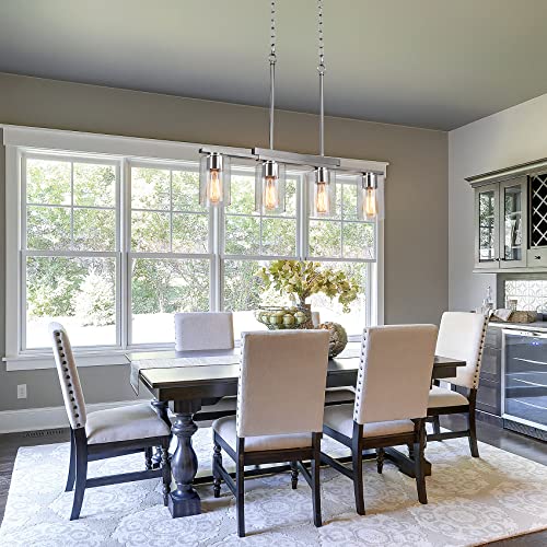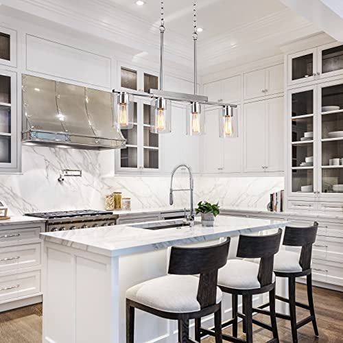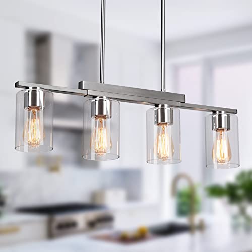 ?Kitchen Light Fixtures?Brushed nickel finish featuring a linear chandelier with 4 clear glass shade. Simple pendant lights kitchen island, add classy and elegant beauty to any interior with its modren farmhouse look, brushed nickel finish suit for modern and Industrial style, suitable for the kitchen island, dining room, living room, etc.