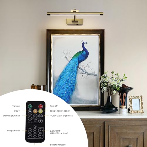 ?Customizable Lighting for Any Setting?: Choose from three distinct color temperatures—3000k, 4000k, and 6500k—to suit various environments and artistic preferences. With stepless brightness adjustment?10%-100%?of dimmable brass gold picture frame sconces with remote, precisely tailor the illumination to showcase your artwork, gallery displays, portraits, and more