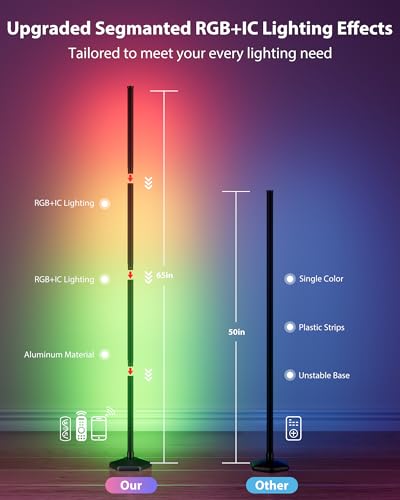 RUGGED AND EASY TO INSTALL: The floor corner lamp is made of a sturdy aluminum alloy shell, the structure is stable, and the heat dissipation performance is excellent. The base is designed with heavy aluminum alloy to prevent the lamp from tipping over and prevent personal injury. The 65-inch/165-cm tall stand lamp with detachable 4-section design and engineered base design, can save you more space