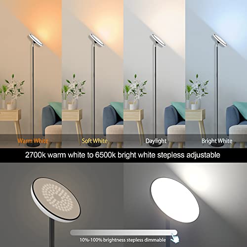 ?Superior Brightness?: The 42W main light delivers over 3700 lumens, from 2700k warm white to 6500k cool white, without glare or strobe effects. Our modern floor lamp illuminates living rooms, bedrooms, or offices brightly and evenly. Smooth or step dimmable from 10% to 100% brightness to meet all your lighting needs, whether for reading, writing, or work ?