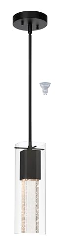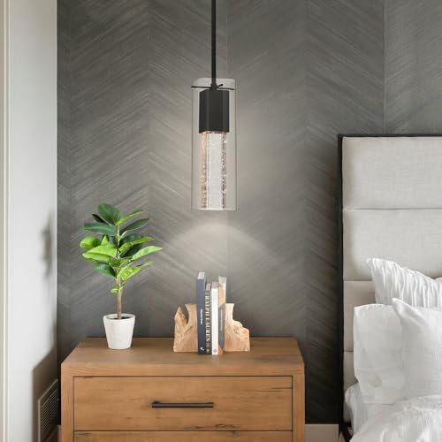 FEATURE: Hardwired. Pendant Light with clear glass shade and square bubble crystal column inside. Matte Black Finish accents and canopy, metal construction. This effervescent bubbles in this mini kitchen hanging pendant lighting will create the stunning visual light beam refract through the crystal bubbles when LED bulbs lights on, then this pendant light will be the eye-catching bright spot in your home.