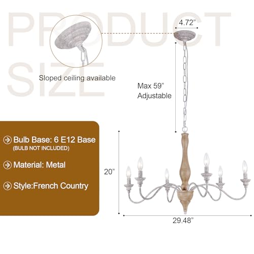 ?Distressed Wood Finish?The 6-lights french country chandelier is meticulously hand-made distressed wood finish metal, ensuring superior quality and durability. Each piece is carefully crafted to create a truly unique and artistic lighting fixture.