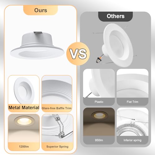 Adjustable : The 4 inch white recessed light LED Baffle-Trim downlights easily fit into 4" housing. Its compact design allows for versatile installation in various spaces. Seamless dimming capabilities (10%-100%) to fit any mood or decor